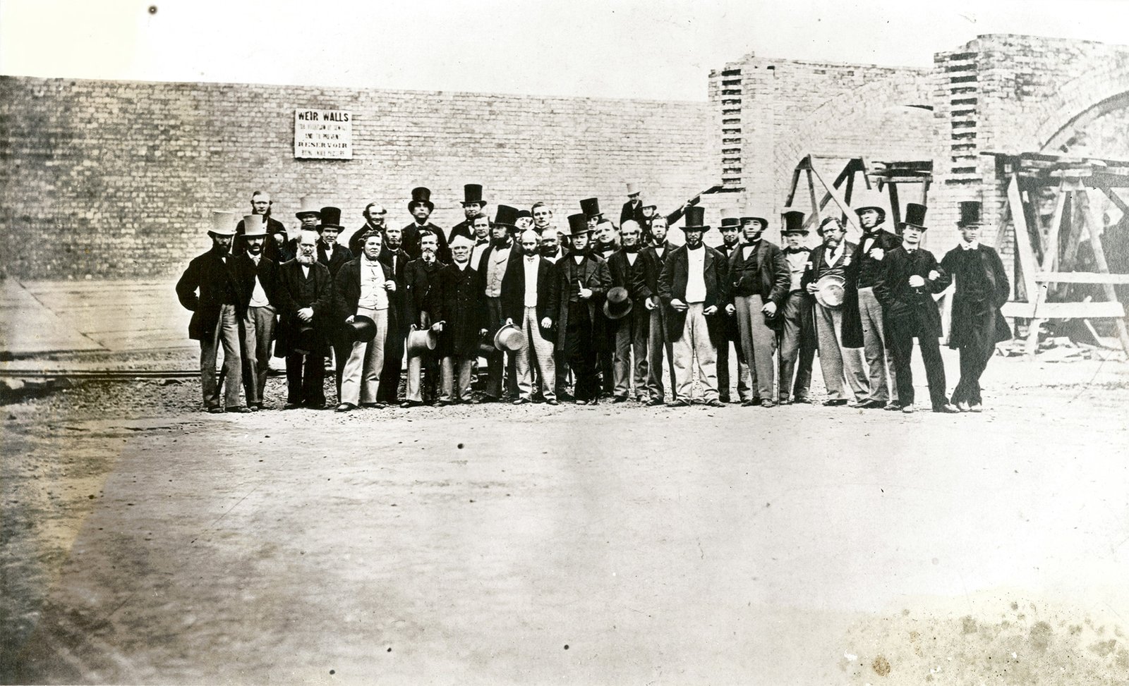 Group photograph of Joseph Bazalgette, engineers and VIPS at Crossness Pumping Station, Bexley. The sign on the wall says, “Weir walls for overflow of sewage and to prevent reservoir being under pressure.” This view has featured in other archival photographs of the building and opening of this facility.
